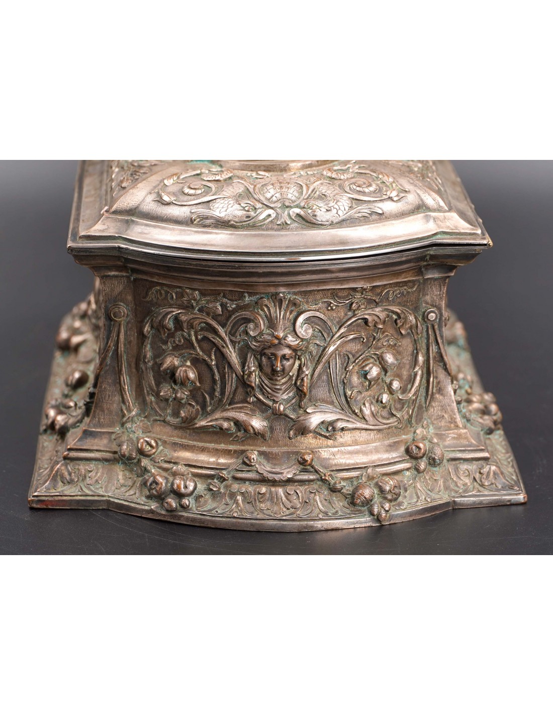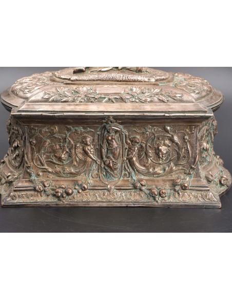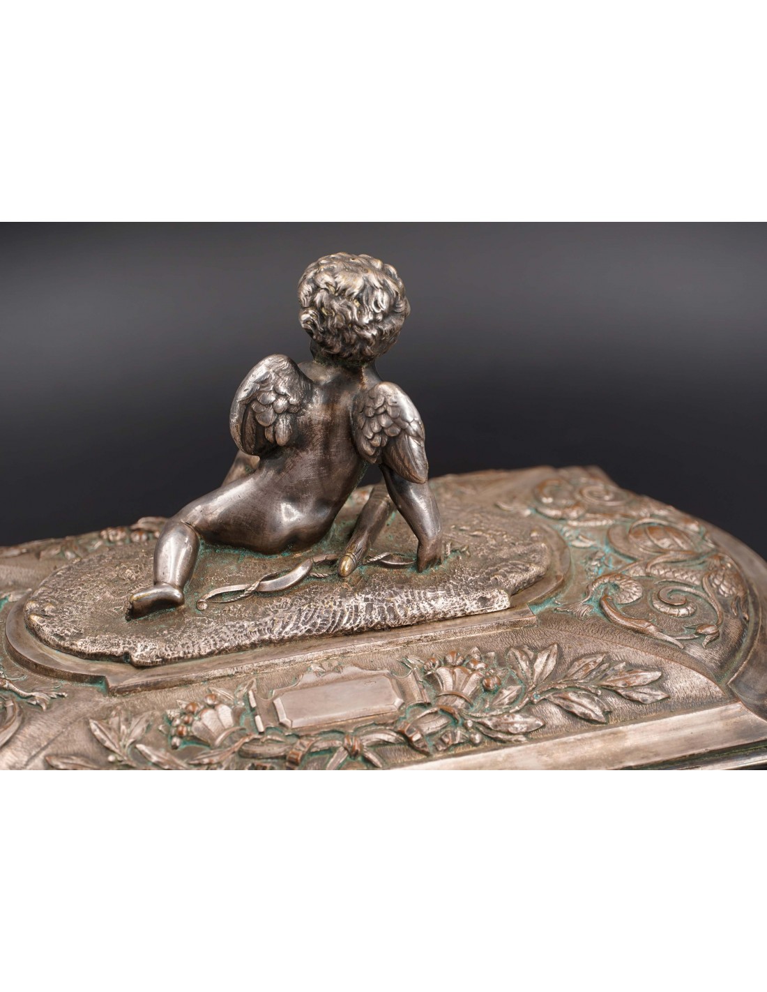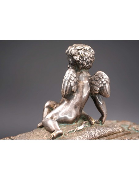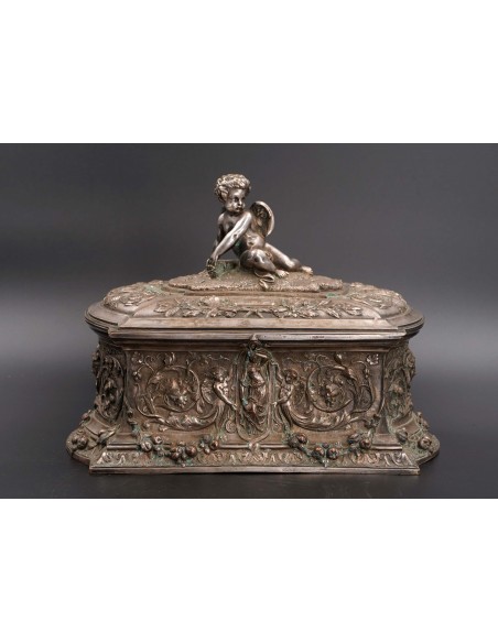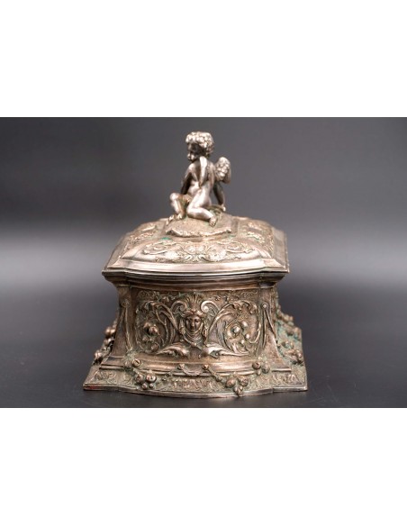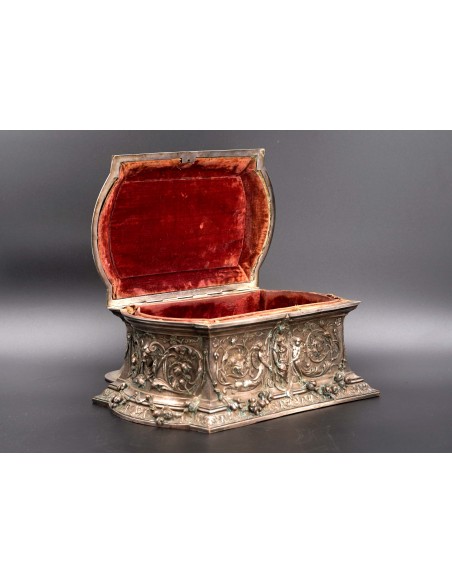 Această elegantă casetă ce se înscrie în siajul stilului Rococo, fiind din această pricină un obiect decorativ foarte preţios cu detalii exceptional manufacturate și un bogat décor în repousse.