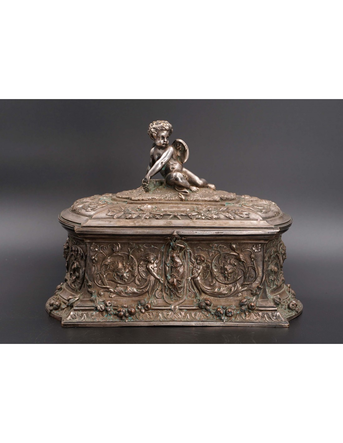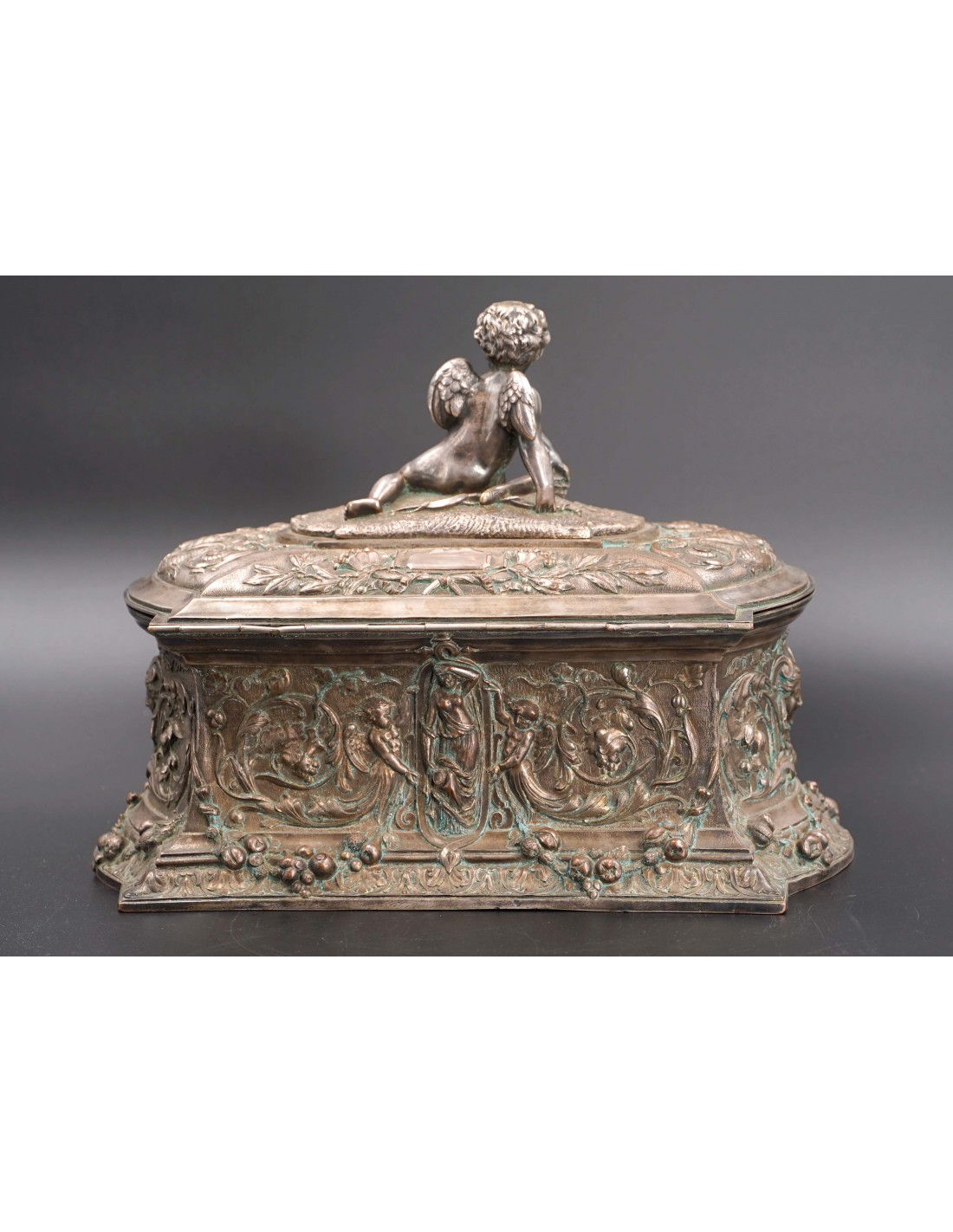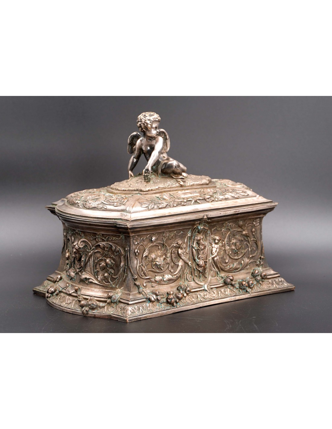 Această elegantă casetă ce se înscrie în siajul stilului Rococo, fiind din această pricină un obiect decorativ foarte preţios cu detalii exceptional manufacturate și un bogat décor în repousse.
