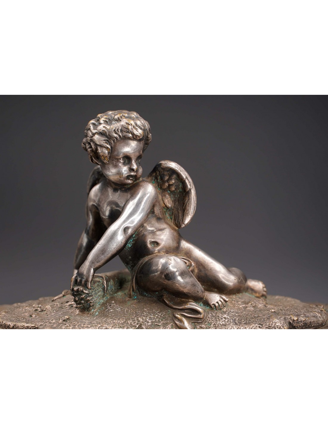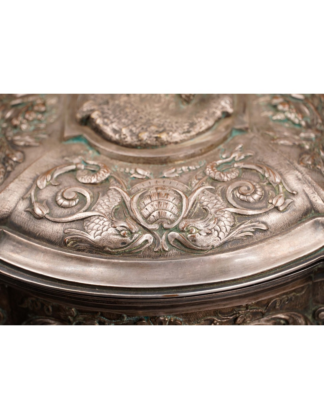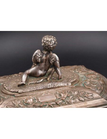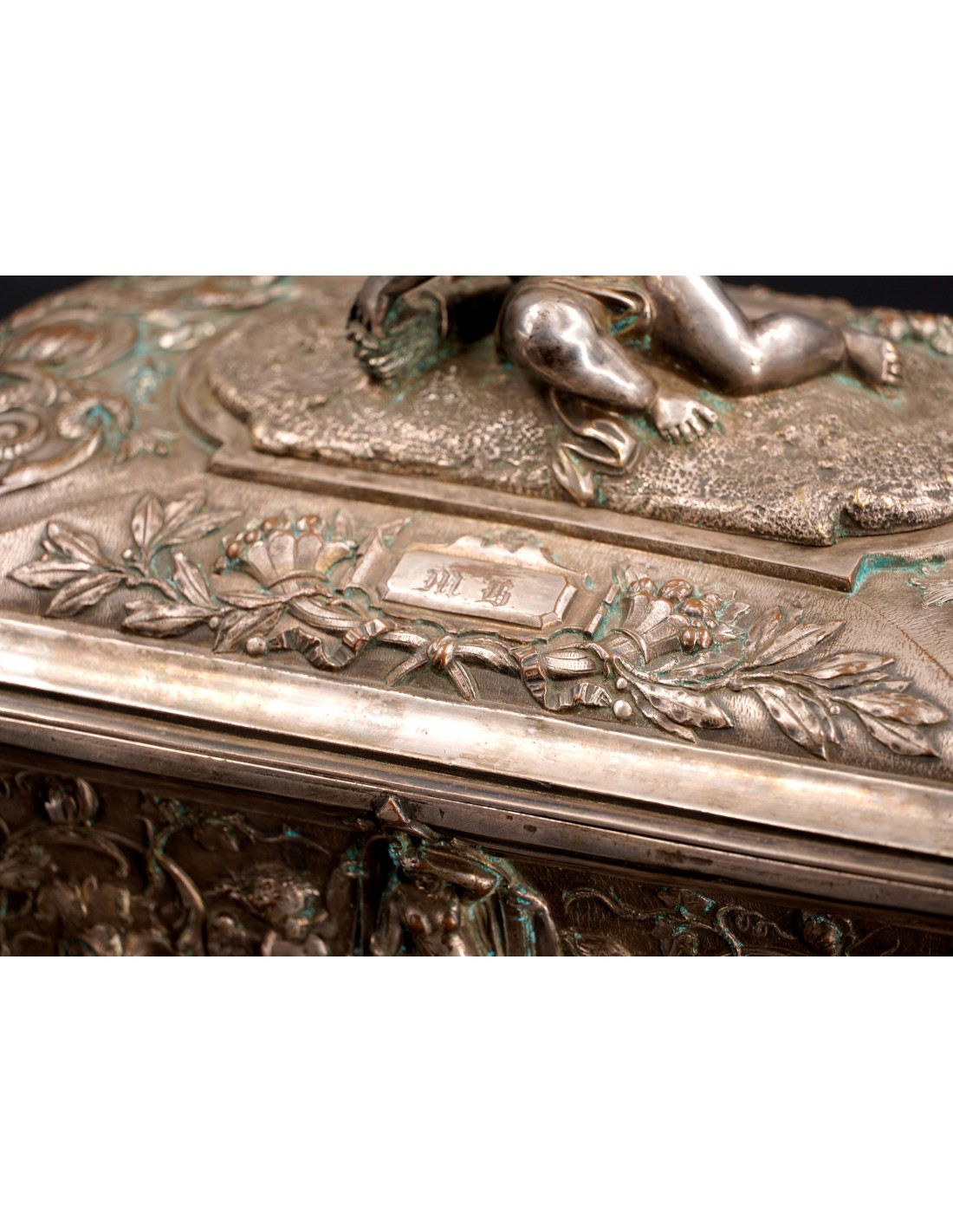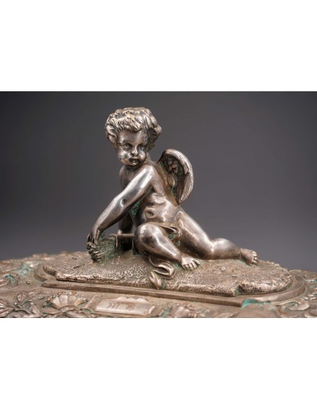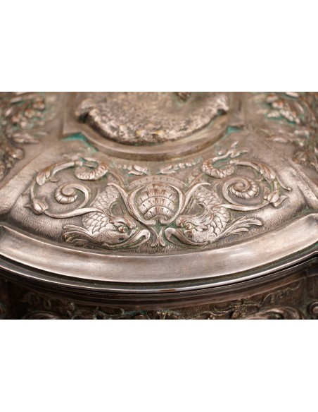 Metal argintat decorat cu amorași, nimfe, tridenți, elemente florale și vegetale. Pe capac este gravată monograma M.B.
