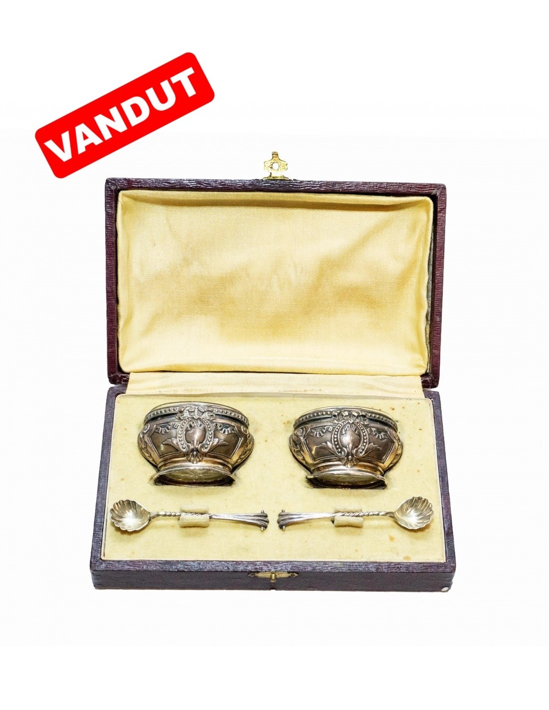 Lingurițele au poansonul de meșter „THOMAS BAMFORD” (fost fabricant specializat în turnare, al cărui maestru a fost Charles Adams, 1705 – 1750). Pereche de recipiente din argint, pentru condimente (sau servirea caviarului), splendid elaborate în stil rococo.