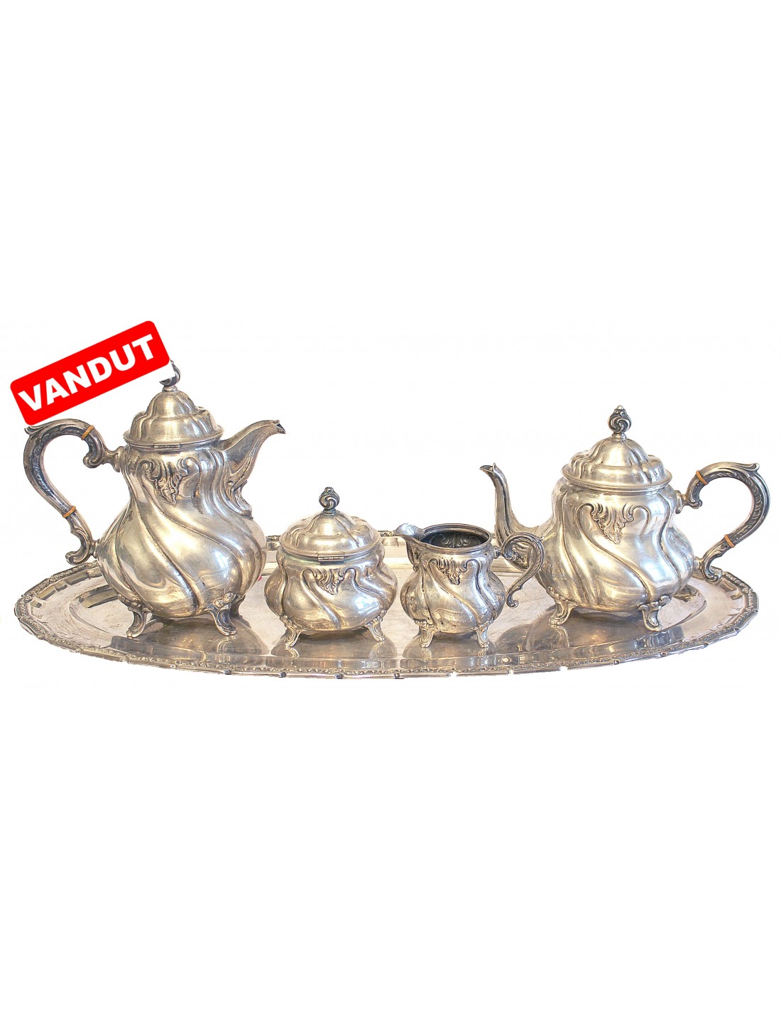 Lucrat în manieră Biedermeier, compus din tavă, ceainic (cafetieră), zaharniță cu anse și capac.