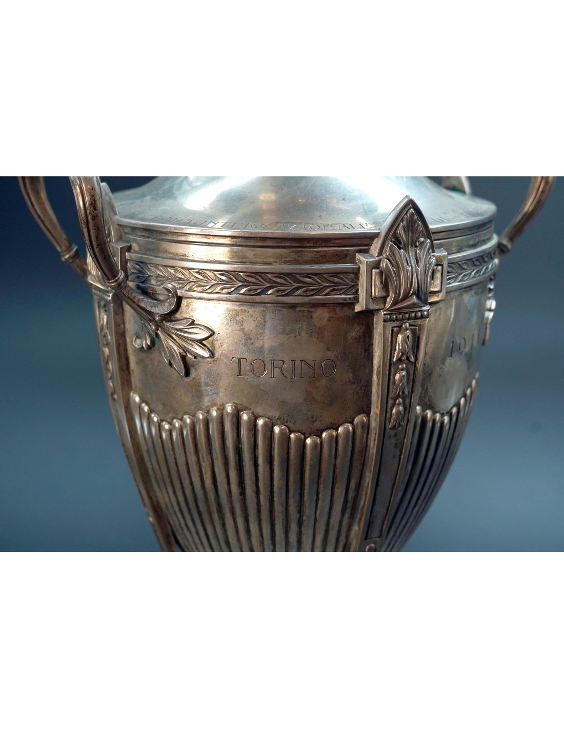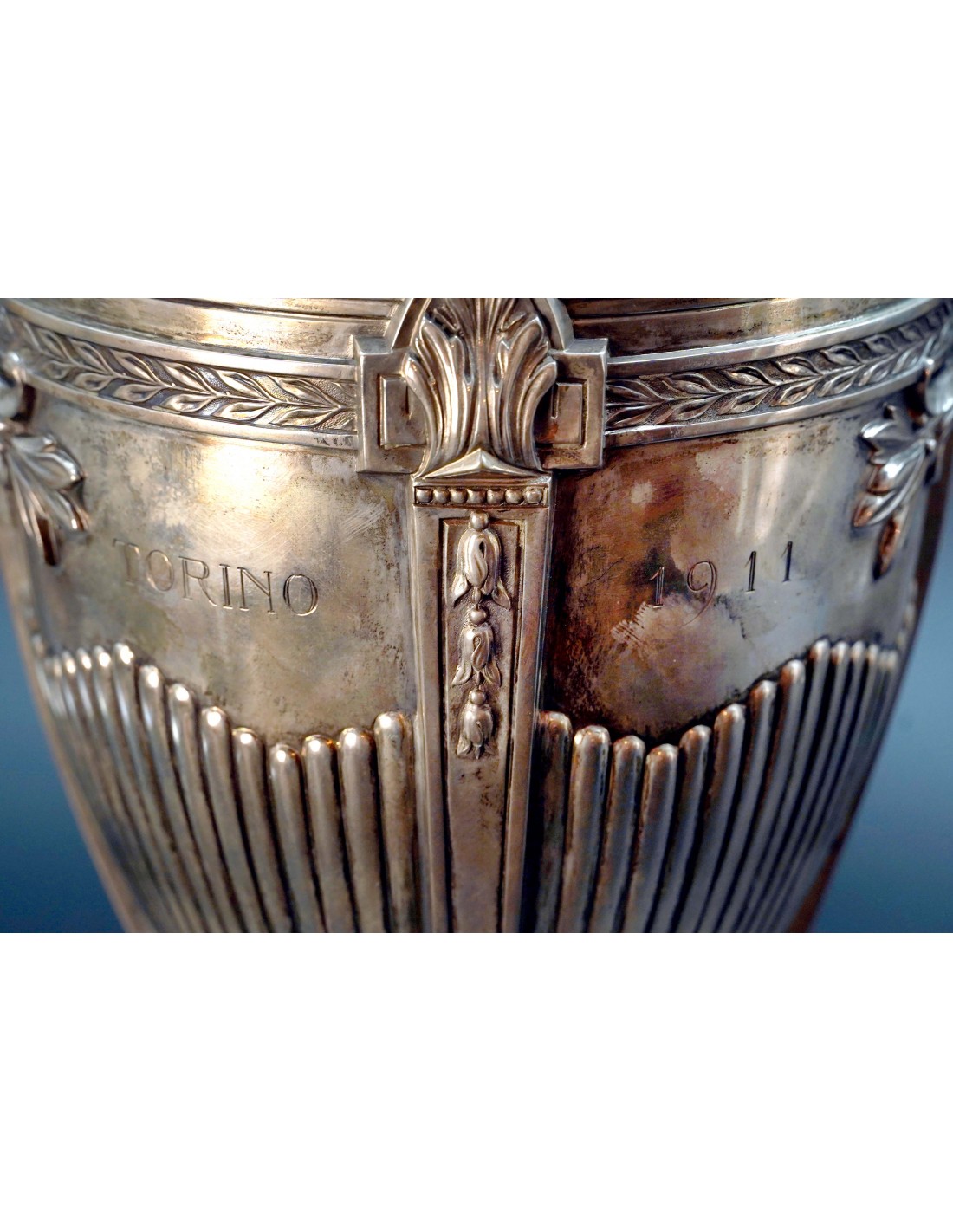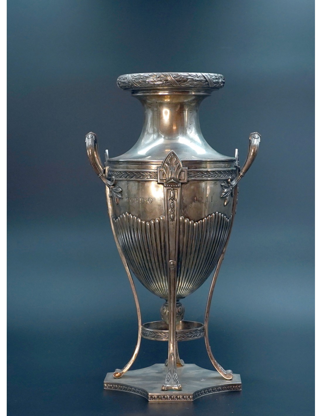 Vasul de formă amforoidală are o decorație cizelată cu minuție de bijutier ce acoperă spațiile dintre cele două anse laterale. Susținut pe patru picioare elansate, prinse pe o bază octogonală cu o friză decorate în basorelief cu motive florale, terminate pe corp în palmete. Corpul piesei are inscripția ”PREMIO DELLE FERROVIE DELLO STATO GARA INTERNAZIONALE DI TELEGRAFIA TORINO 1911”, o suprafaţă cu caneluri și elemente vegetale şi este prevăzut cu două mânere prinse prin motive palmete, Lucrat cu minuţie şi acurateţe de bijutier vasul provine din Anglia, celebra manufactură BREMER SILBERWARENFABRIKeste un adevărat şi preţios obiect de colecţie.