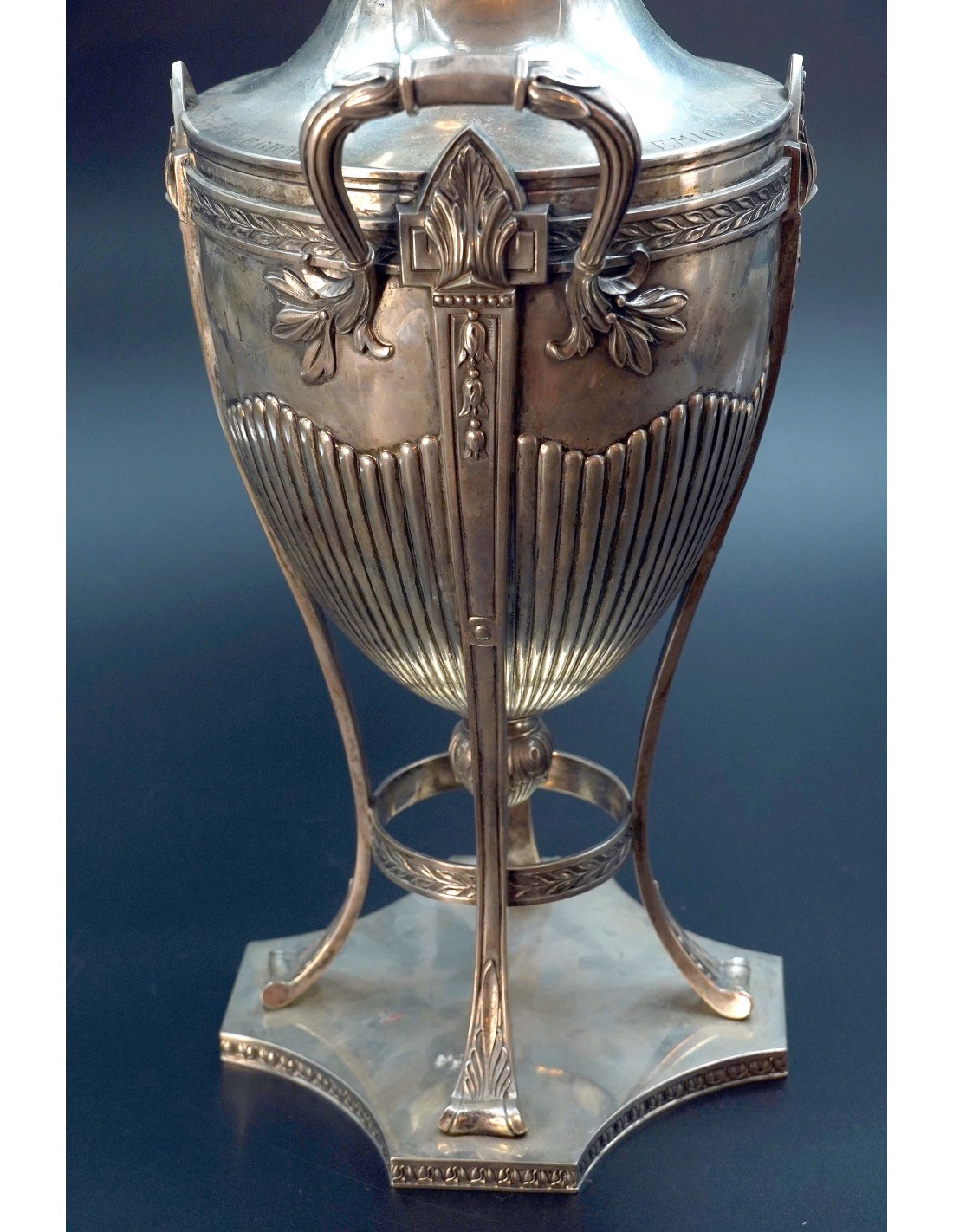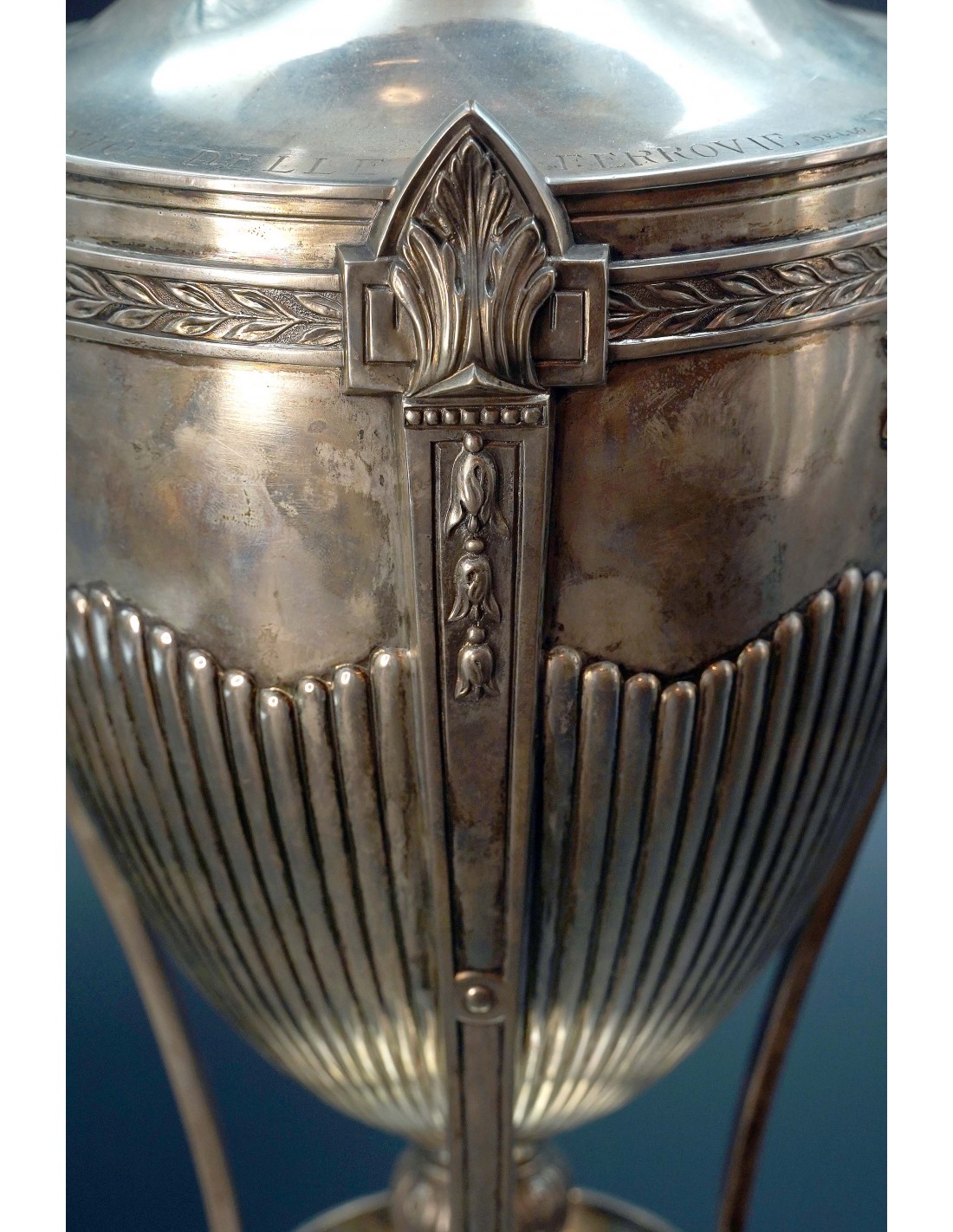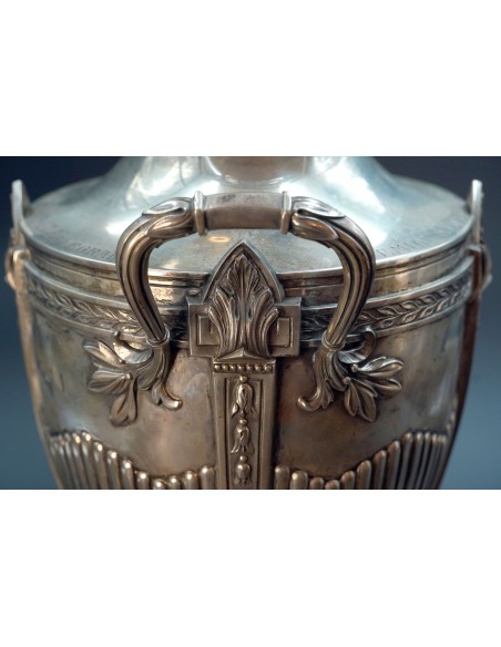 Vasul de formă amforoidală are o decorație cizelată cu minuție de bijutier ce acoperă spațiile dintre cele două anse laterale. Susținut pe patru picioare elansate, prinse pe o bază octogonală cu o friză decorate în basorelief cu motive florale, terminate pe corp în palmete. Corpul piesei are inscripția ”PREMIO DELLE FERROVIE DELLO STATO GARA INTERNAZIONALE DI TELEGRAFIA TORINO 1911”, o suprafaţă cu caneluri și elemente vegetale şi este prevăzut cu două mânere prinse prin motive palmete, Lucrat cu minuţie şi acurateţe de bijutier vasul provine din Anglia, celebra manufactură BREMER SILBERWARENFABRIKeste un adevărat şi preţios obiect de colecţie.