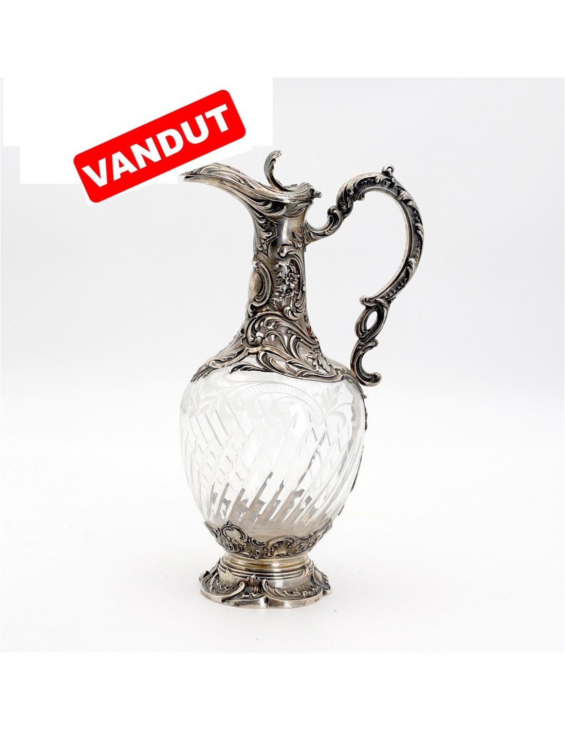 Carafa din cristal are corpul piriform decorat cu volute şi motive floral-vegetale. Gâtul, ansa, baza circulară şi capacul din argint sunt bogat decorate cu motive vegetale şi volute rococo.