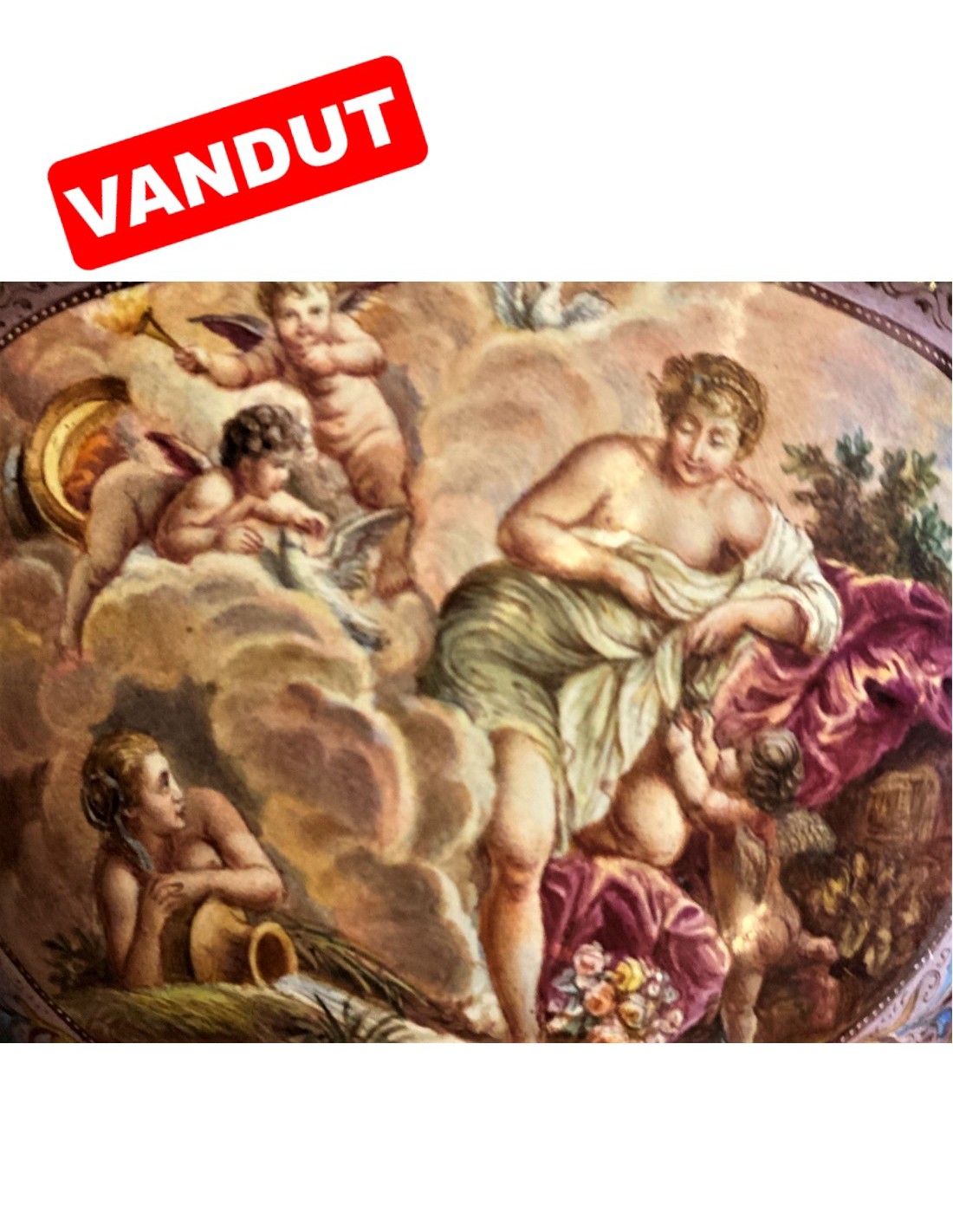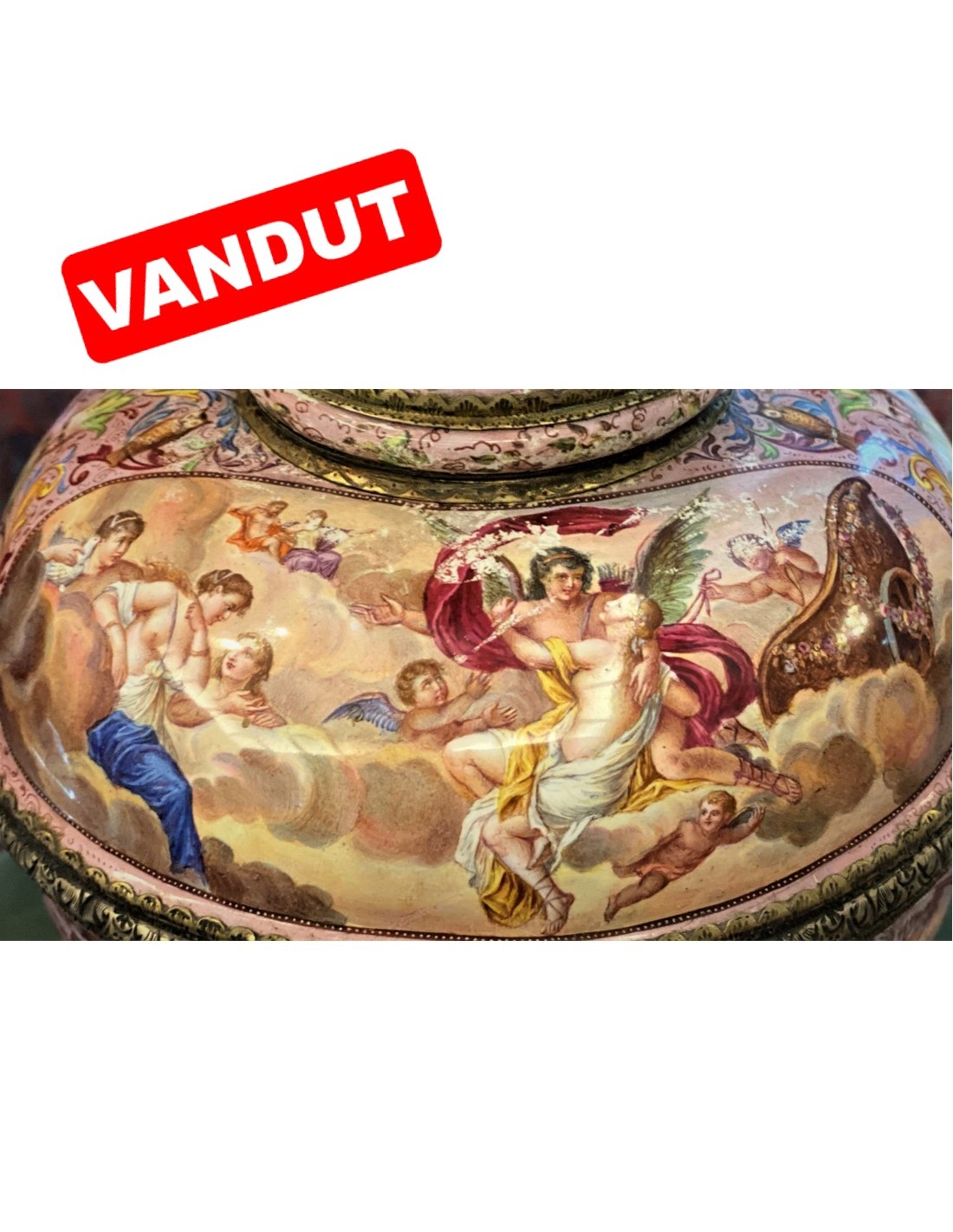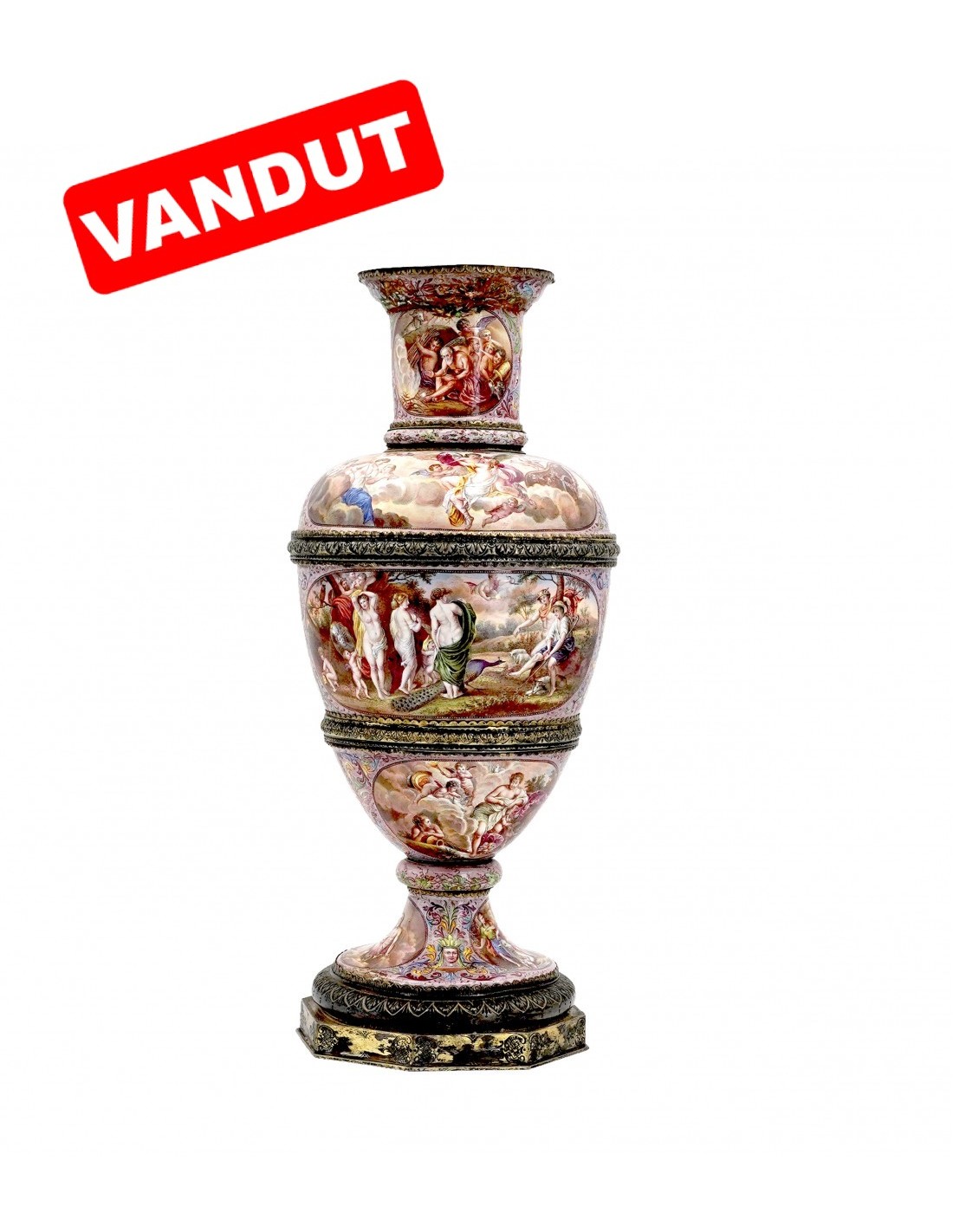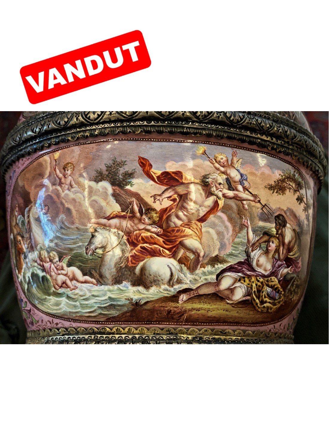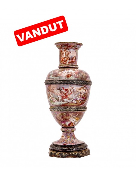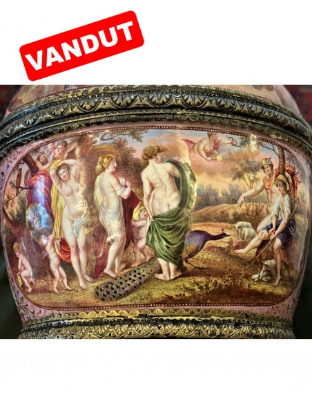 Vasul este remarcabil pictat cu subiecte din mitologia greacă Compoziția este organizată în registre ascendente și circulare, conferindu-i vasului doua fețe, la fel de importante, la fel de spectaculoase. Între aceste scene cu caracter narativ decorul continuă cu animale fermecătoare și măști plasate printre frunze de acant. Scenele principale ilustrează Judecata lui Paris și Cucerirea Amfitritei de către Neptun. Celelalte fac referire la Cupidon, Psihe, la bunăvoința zeilor față de muritori. Pe baza hexagonală este marca producătorului și mărcile de control vieneze. Se spune despre Leopold Weininger că e ultimul din marea familie de argintari și aurari inițiată de Benvenuto Cellini.