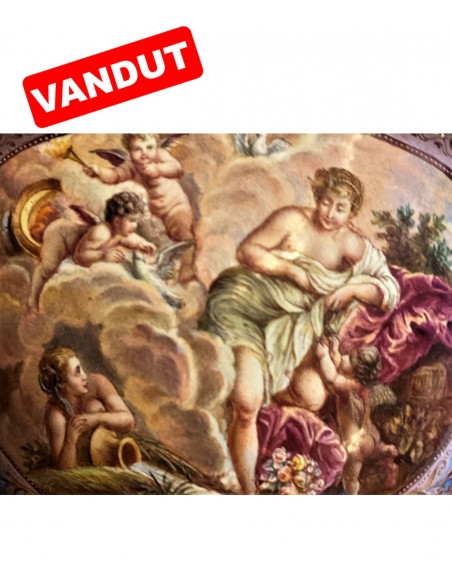 Email pictat manual și argint aurit.