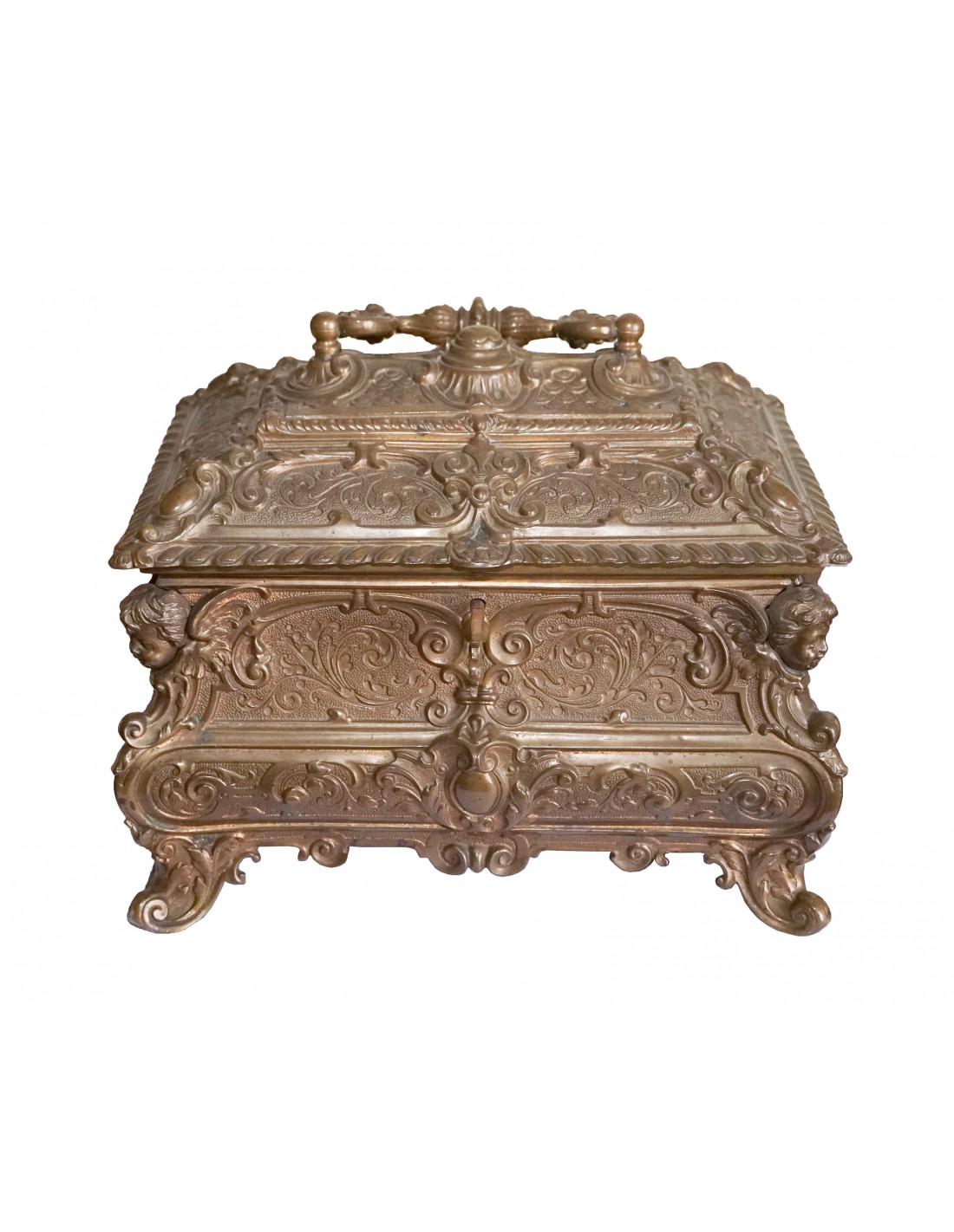 Bronz patinat decorat în relief cu motive renascentiste, capitonaj cu mătase și cheie originală.