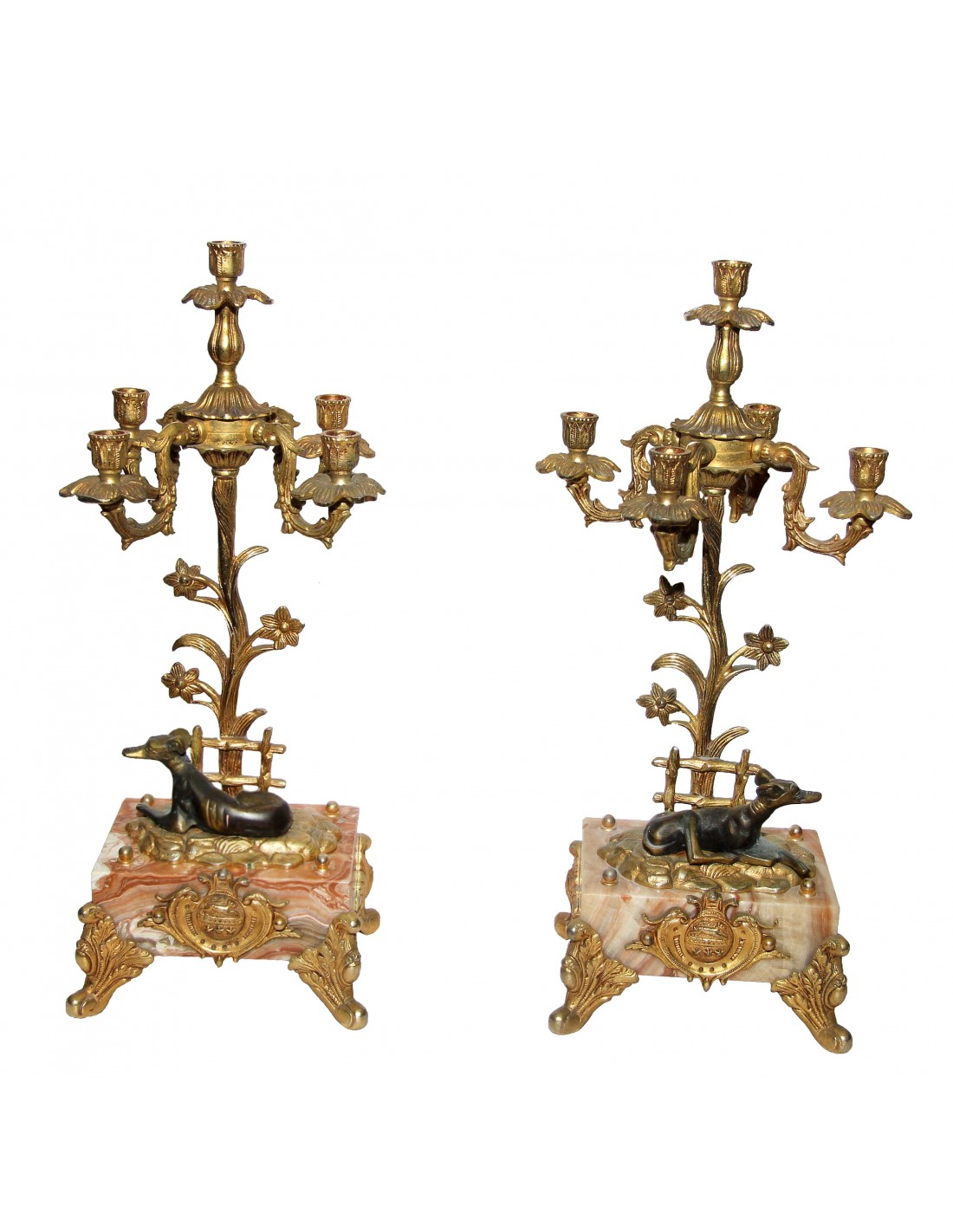 Perechea de sfeșnice cu cinci lumini au postament din marmură cu profil dreptunghiular susținut pe patru piciorușe, din bronz, decorate cu elemente florale și vegetale, blazoane imperiale și două mici sculpturi, ronde bosse, din bronz patinat ilustrând doi ogari tuareg sloughi.