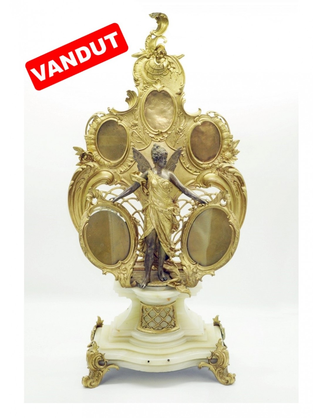 Panoplie cu cinci rame pentru fotografii, bronz dore, pe suport de onix, elemente rococo. Semnată Bormel (18)93.