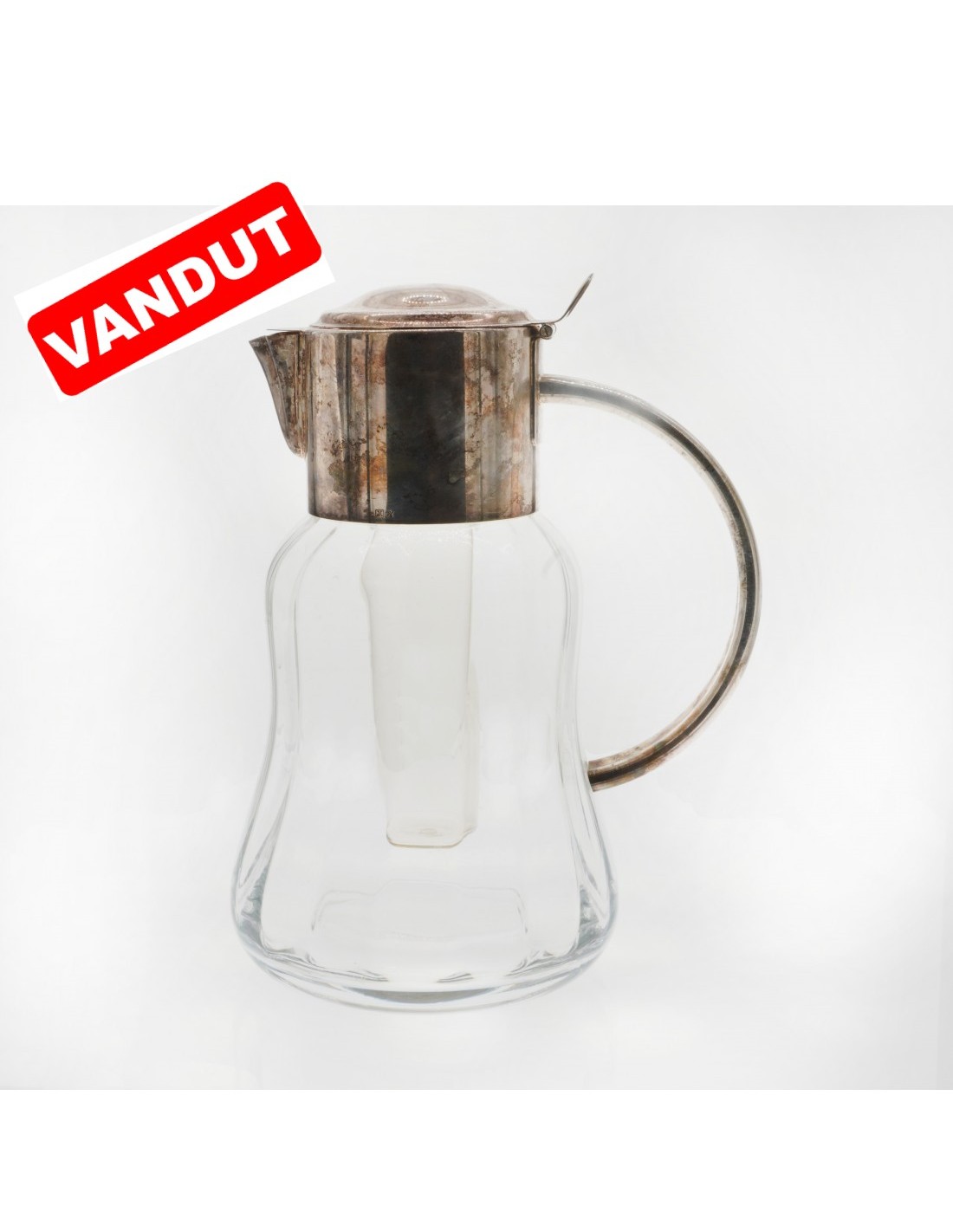 Carafă de prezentare cu gâtul şi mânerul lucrate cu un model de o extremă eleganţă din metal argintat. Asociate cu corpul din cristal fin gravat, rezultă o piesă absolut încântătoare. Sobrietatea decorului, eleganţa formei şi marcajele o atribuie creaţiei unui iscusit meşter argintar.